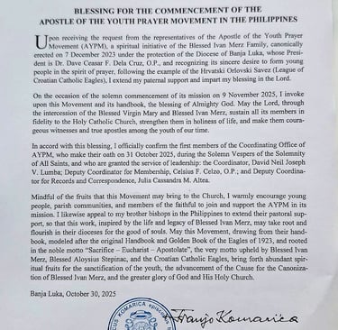 On November 16, 2025 (instead of the original date of November 9, because the island was severely hit by a typhoon), the Apostle of the Youth Prayer Movement celebrated the Rite of Solemn Admission and Commissioning of the inaugural members. This day marked the official beginning of the Movement’s public mission in the Philippines: the formation of youth apostles of prayer, modeled on the spirituality of Blessed Ivan Merz and the original Croatian Orlovstvo of 1923.