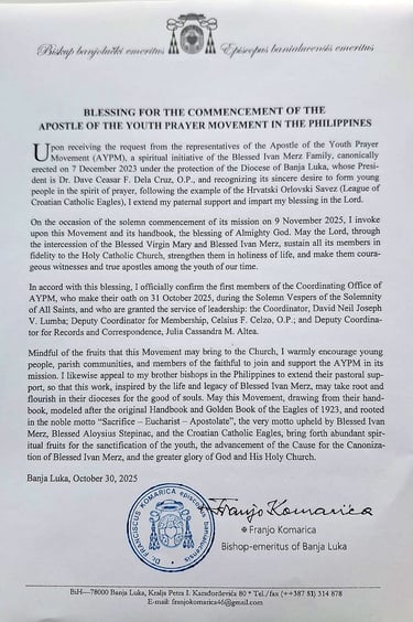 In a letter dated 30 October 2025, Bishop-emeritus Komarica extended his paternal affection, imparted his blessing on the Apostle of the Youth Prayer Movement (AYPM), the Filipino revival of the Hrvatsko Orlovstvo established in 1923, and called upon his brother bishops in the Philippines to promote it. In the same blessing, he confirmed its first Coordinating Office: Coordinator: David Neil Joseph V. Lumba; Deputy Coordinator for Membership: Celsius F. Celzo, O.P.; and Deputy Coordinator for Records & Correspondence: Julia Cassandra M. Altea.